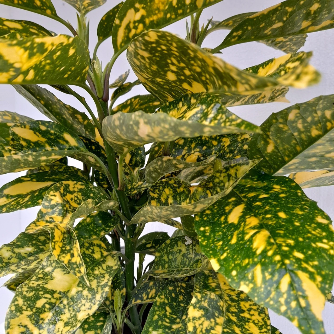 A handsome plant that has strong green and gold variegation. The large leaves are regularly mottled in shades of green and canary yellow. The leaves are long and quite broad. The shrub makes an imposing feature, useful to brighten a shady corner, or handsome in a sunny spot.